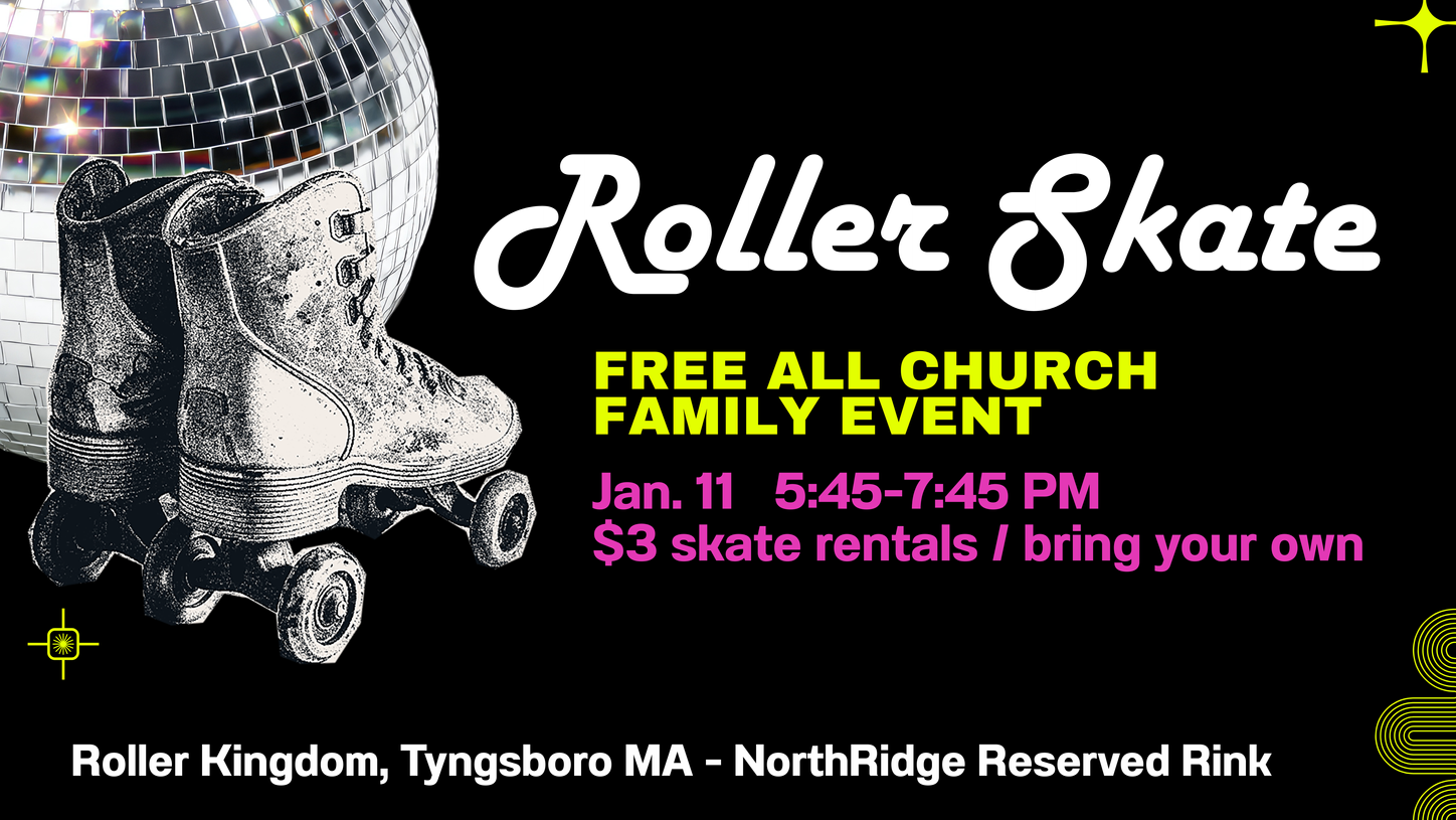 Details: Have a blast at this all church family event at Roller Kingdom on January 11. Great music - Limbo - Big Screen - Food - Fun - Friends! We reserved the entire rink. It’s Free! Bring your own skates / $3 skate or blade rentals.